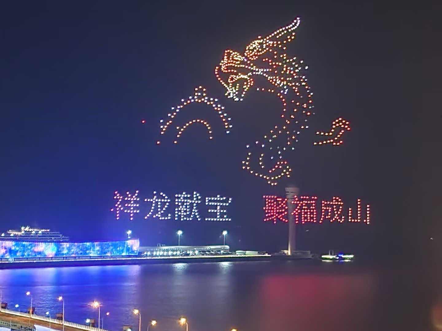 表演当晚,千架无人机组成了“祥龙献宝 聚福成山”的画面,为市民游客送上新春祝福。上海邮轮港国际帆船赛标识、邮轮港建筑轮廓等图案,展现了宝山滨江通江达海、三江交汇的独特风貌。