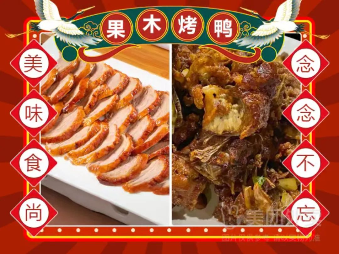 “果木烤鸭”对烤鸭进行现代化改良,以枣树、梨树、苹果树等果木配比烤制而成。鸭皮富有果香味,脆而肉嫩,具有一鸭二吃的特点。
