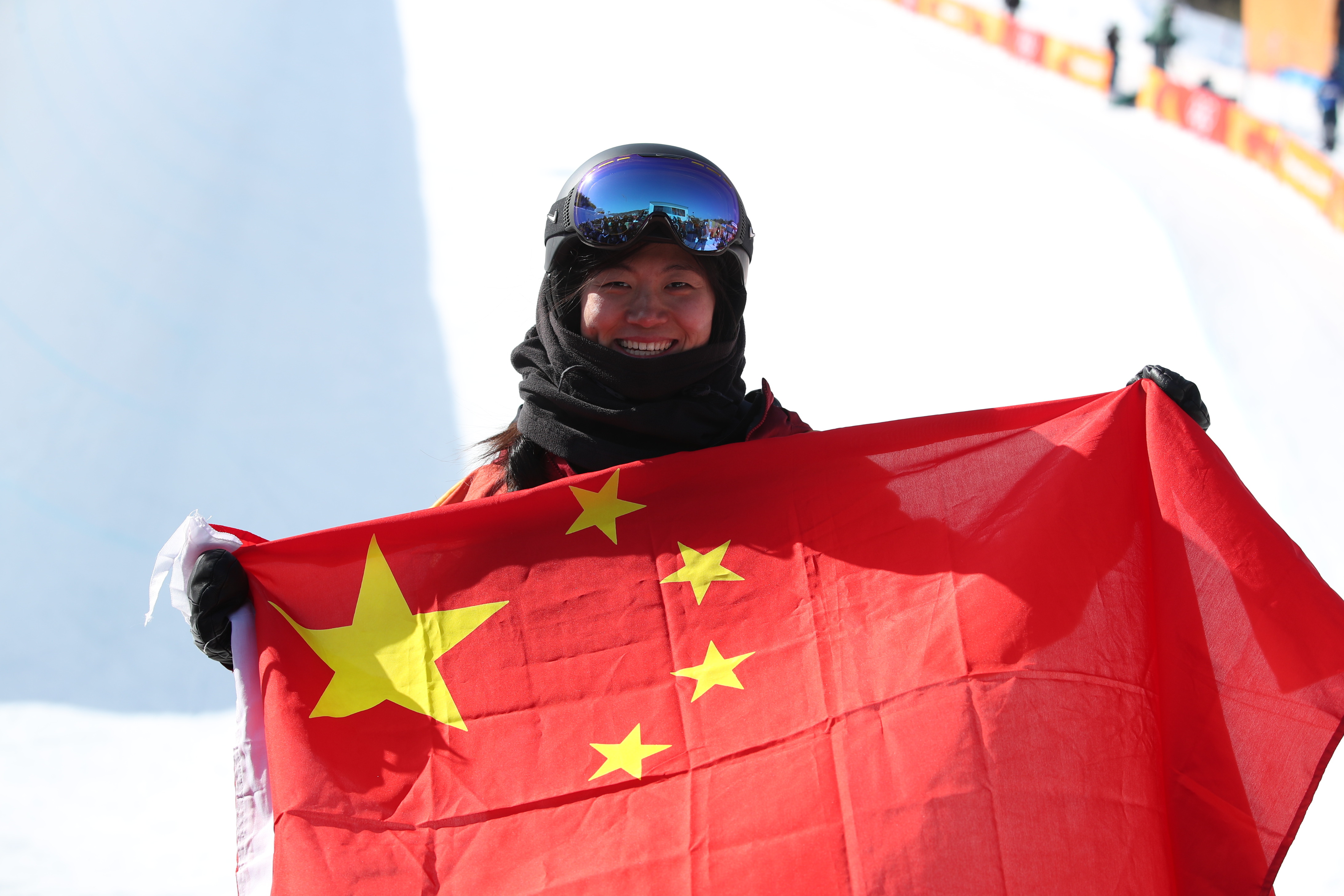 2018年2月13日,中国选手刘佳宇在比赛后庆祝。当日,在2018年平昌冬奥会单板滑雪女子U型场地技巧决赛中,刘佳宇获得银牌。新华社记者费茂华摄