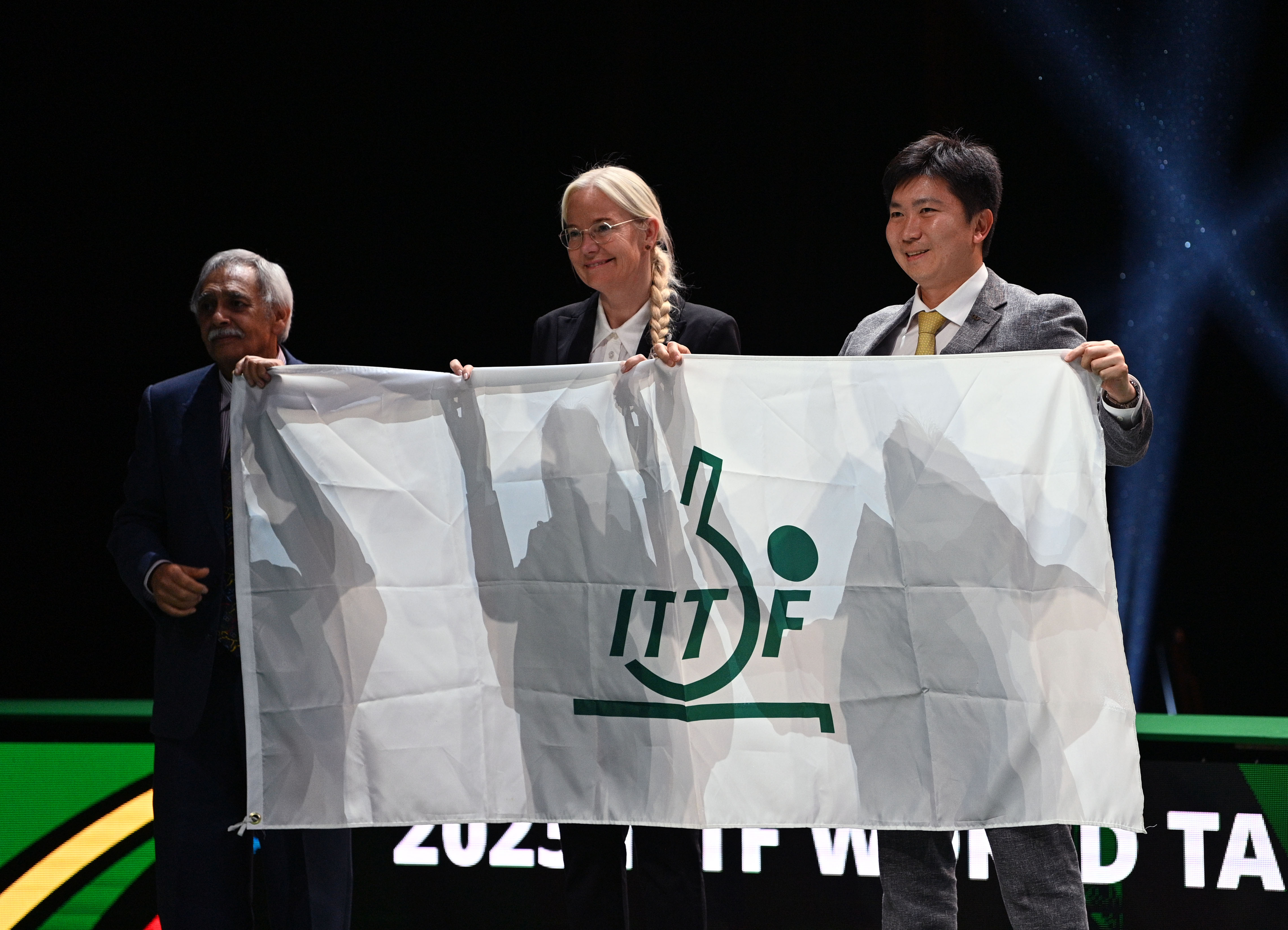 2023年5月28日,国际乒联主席佩特拉·索林(中)将国际乒乓球联合会旗帜交给下届世乒赛举办国代表、韩国乒协主席柳承敏(右)后合影。新华社记者 陶希夷 摄