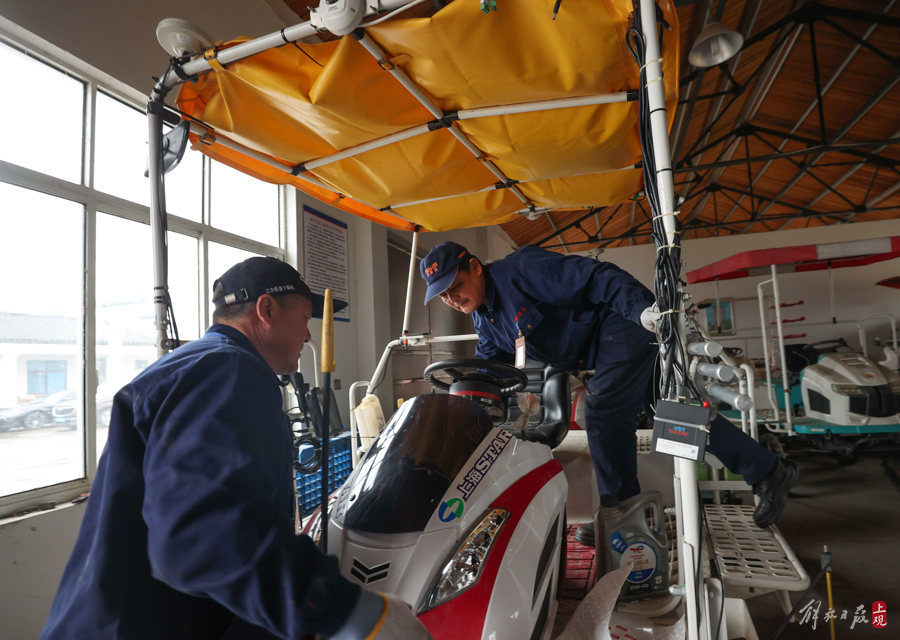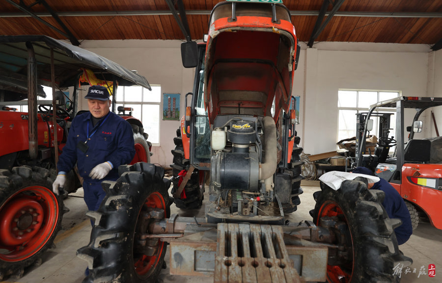 2024年2月22日,农机维保师在松江小昆山镇冠军机农互助点保养拖拉机。