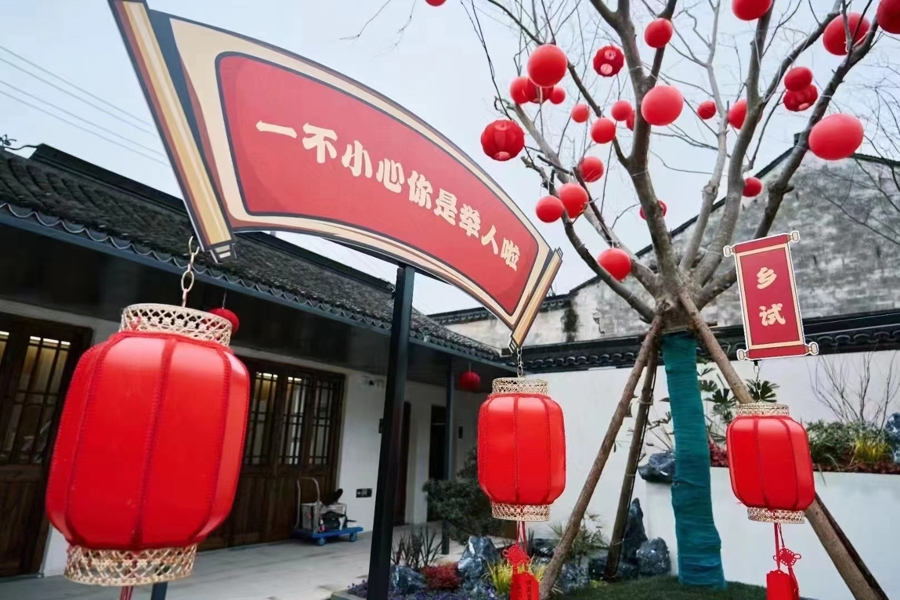 “枫泾在历史上共孕育出了3名状元、56名进士、122名举人、235名文化名人,‘状元文化’传承久远。这次灯谜节我们将枫泾特色灯谜、状元文化、文创产品与新开业的朵云书院相结合,为的就是在创新和延续中吸引更多年轻群体的参与。”上海枫泾古镇旅游发展有限公司总经理陈利军介绍说,在环节上,他们也进行了精心设置,从书院门口沿指示牌层层深入,分为书生灯谜区、科举灯谜区、殿试三甲区,“给人一种进京赶考的趣味体验”。