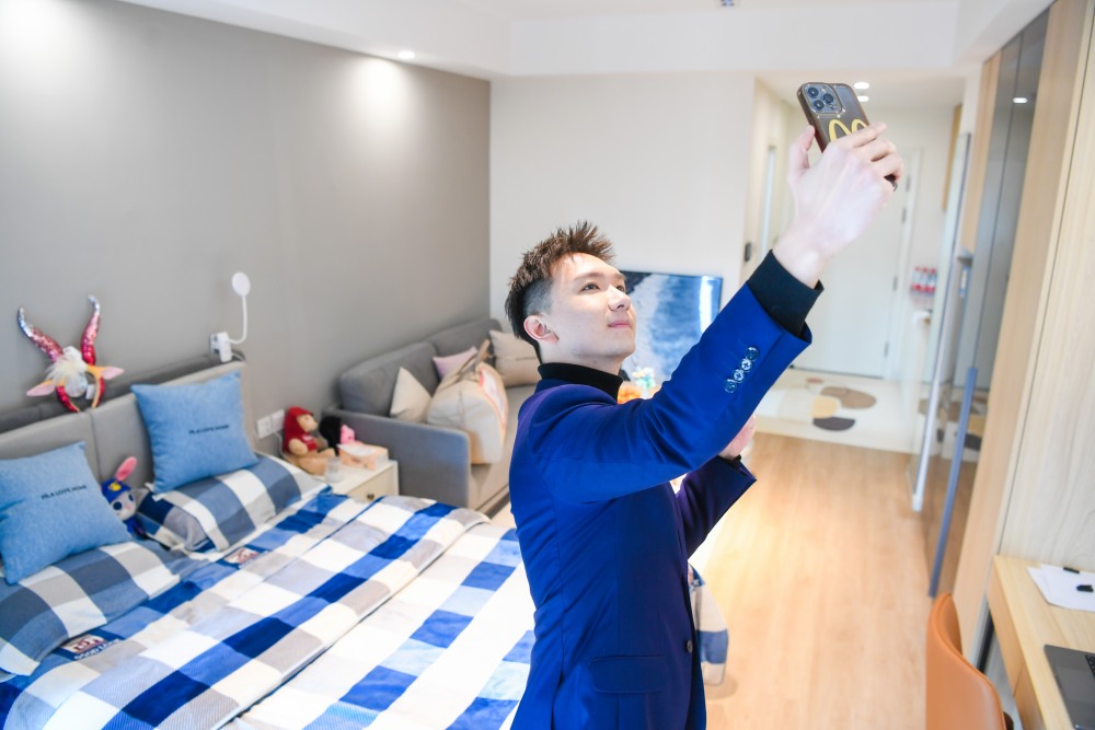 在东方广播中心工作的九零后小伙潘越文入住人才公寓后与家人视频通话,介绍自己的新房间。(文汇报张伊辰 摄)