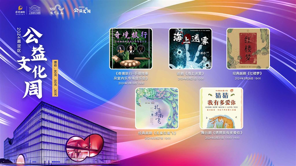 本次公益文化周将自3月19日至3月31日,共有4台6场演出,涵括当下年轻人追捧的手碟与室内乐音乐会《奇境旅行》、悬疑话剧《海上迷雾》、上海越剧院经典越剧《红楼梦》、《孔雀东南飞》,以及绘本改编儿童剧《猜猜我有多爱你》供不同年龄段观众选择。期间,还会策划工作坊、演后谈等多场配套活动,提升观众参与感。