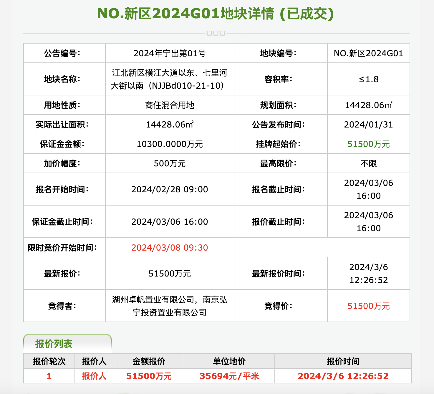 NO.新区2024G01地块为江北新区横江大道以东、七里河大街以南(NJJBd010-21-10)。东至胜利路;西至规划道路;南至规划道路;北至七里河大街。规划用地性质为商住混合用地,出让面积14428.06平方米,容积率1.01≤R≤1.8,建筑高度≤100米。挂牌起始价51500万元。该地块由湖州卓帆置业有限公司及南京弘宁投资置业有限公司联合以底价摘得。