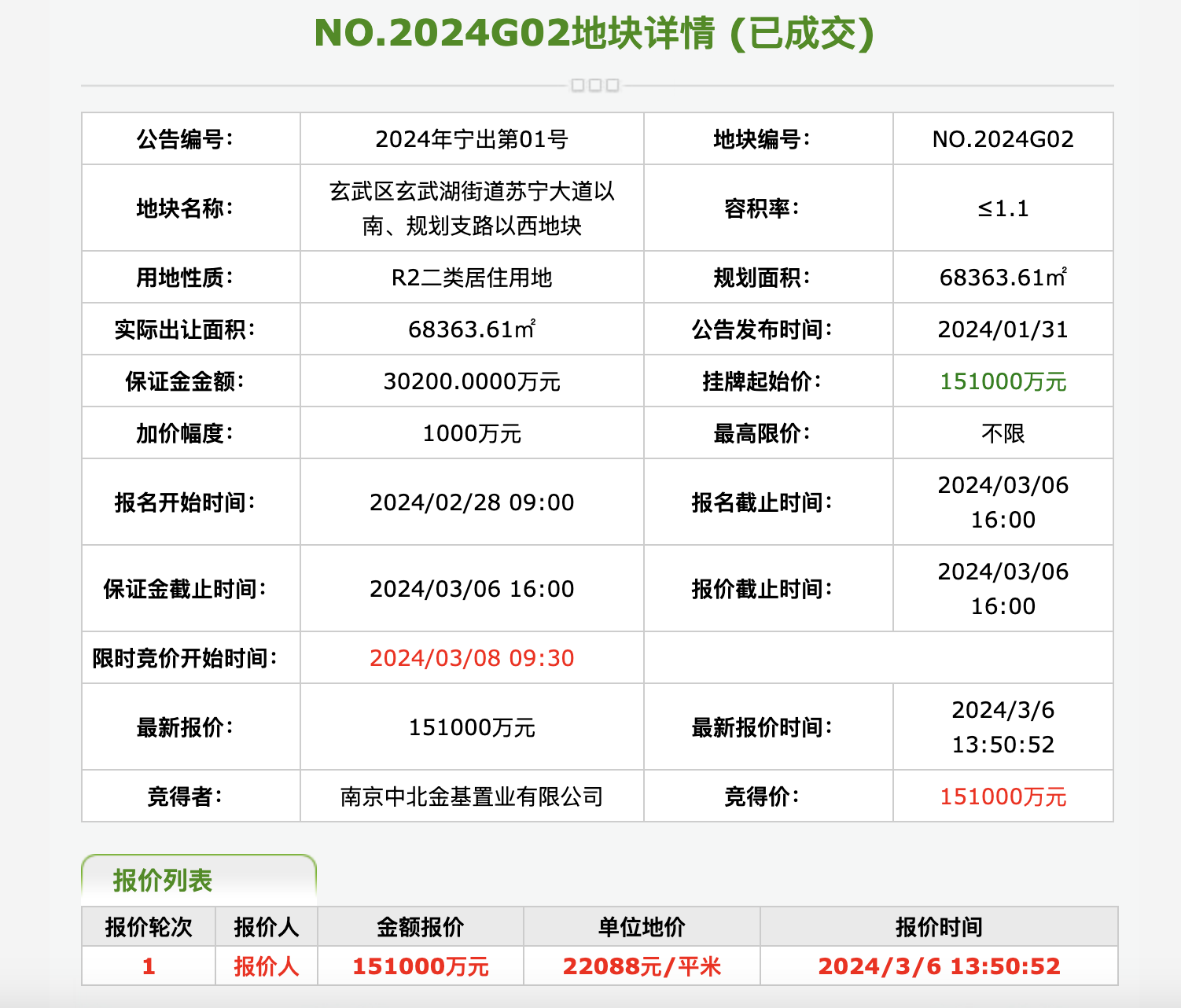 根据此次出让地块的信息,NO.2024G01地块为建邺区南苑街道江东中路以东、福园街以南地块。东至现状住宅;南至现状住宅;西至江东中路;北至福园街。规划用地性质为R2二类居住用地,出让面积29808.63平方米,容积率1.0<Far≤2.2,建筑高度≤80米。该地块挂牌起始价235000万元。最终,该地块由南京玄盛房地产开发有限公司以底价摘得。据天眼查信息,该公司由乐富投资有限公司和招商局地产(南京)有限公司分别持股60%及40%。