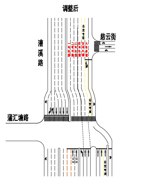 公安交警部门经过调研,进行了一次“微创手术”:将公交专用车道调整到6号车道,保持6号车道的 “直行右转”不变,并漆画路口导向线做好导流,引导需右转进入慈云街的社会车辆汇流至6号车道进行右转。优化措施实施后,漕溪路蒲汇塘路路口原本两股交通流产生的交织冲突明显减少,路口拥堵积压情况基本消除,在缓解路口交通压力的同时也消除了安全隐患。