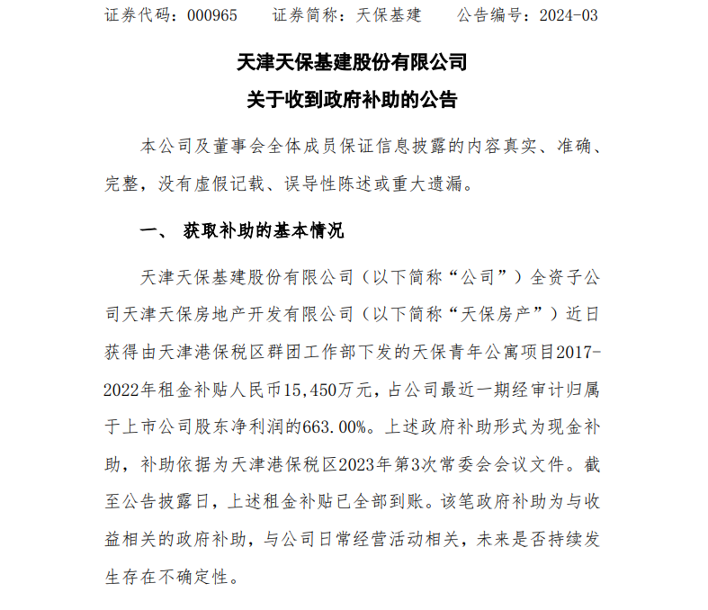 公告称,天津天保基建股份有限公司(以下简称“公司”)全资子公司天津天保房地产开发有限公司(以下简称“天保房产”)近日获得由天津港保税区群团工作部下发的天保青年公寓项目2017-2022年租金补贴人民币15,450万元,占公司最近一期经审计归属于上市公司股东净利润的663.00%。上述政府补助形式为现金补助,补助依据为天津港保税区2023年第3次常委会会议文件。截至公告披露日,上述租金补贴已全部到账。该笔政府补助为与收益相关的政府补助,与公司日常经营活动相关,未来是否持续发生存在不确定性。