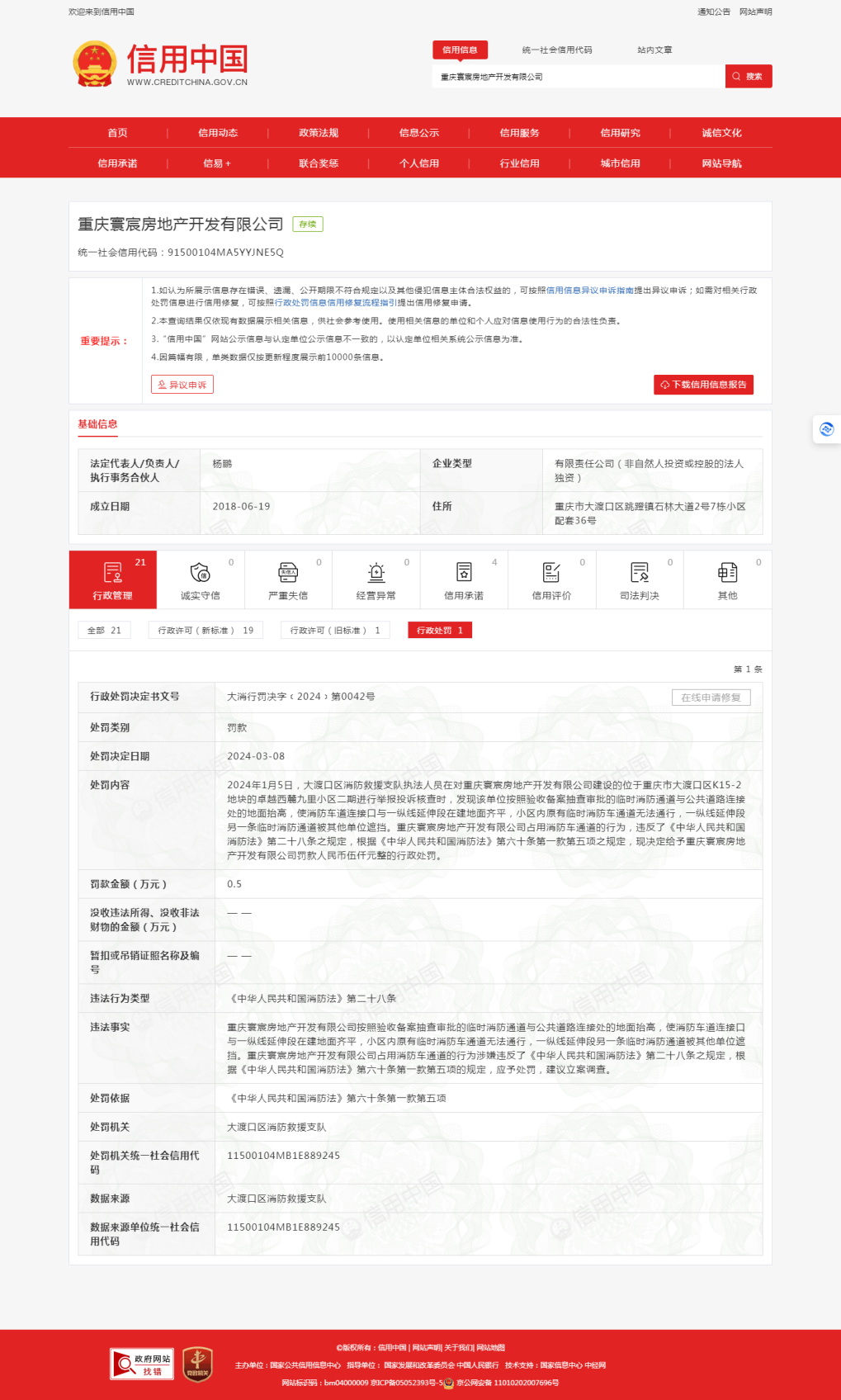 中国质量新闻网讯 近日,信用中国网站披露,重庆寰宸房地产开发有限公司因占用消防车通道的违法行为被罚。
