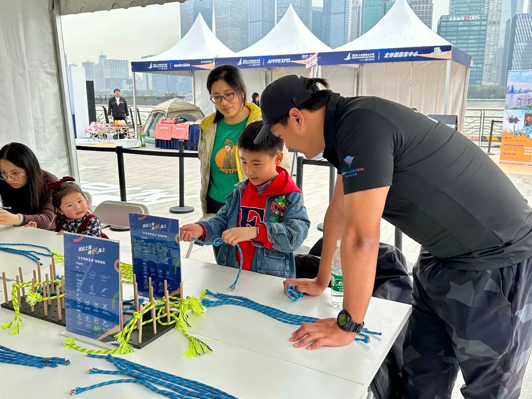 在“水手绳结互动”体验区,有投身帆船运动十年的教练教大家打水手绳结,简单绳结、“8”自形结……成为水手需要的绳结法都能学到。