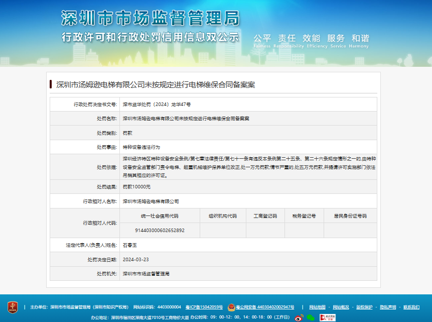 深圳市市场监督管理局对深圳市汤姆逊电梯有限公司罚款10000元。