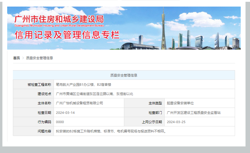 公示信息显示,被检查工程是笔岗航大产业园B1办公楼、B2宿舍楼,建设地点位于广州市黄埔区云埔街道东区连云路以南、东恒街以北,检查部门是广州开发区建设工程质量安全监督站。广州广怡机械设备租赁有限公司作为起重设备安装单位,存在拟安装的B2栋施工升降机梯笼、标准节、电机编号现场与报送资料不相符的问题,被广州市住房和城乡建设局信用记录及管理信息专栏公示。上网公示日期是2024年3月25日。