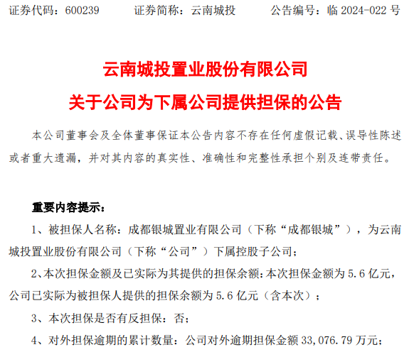 中国质量新闻网讯 近日,云南城投置业股份有限公司(以下简称“云南城投”)发布公告,为下属控股子公司成都银城置业有限公司(下称“成都银城”)提供担保。
