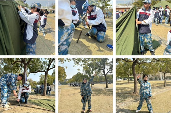 3月19日,同学们随着红日的升起起床。今日上午学习的技能是捕俘拳与搭帐篷,教官讲解了相关器材后,同学们分两个小组搭建帐篷。学习扑俘拳时,同学们“拳”力以赴,打出了英姿飒爽。“水到渠成”和“看图识图”这两个游戏考验同学们之间的默契、团结与沟通,广场上时不时传来同学们的欢呼声与掌声。下午学校领导金向敏书记与学生发展处倪老师来到军训基地探望全体高一学子,为大家加油打气。晚上,同学们前往剧场观看爱国主义电影。