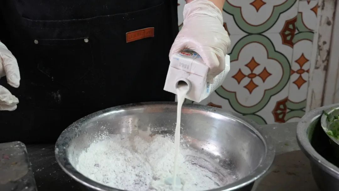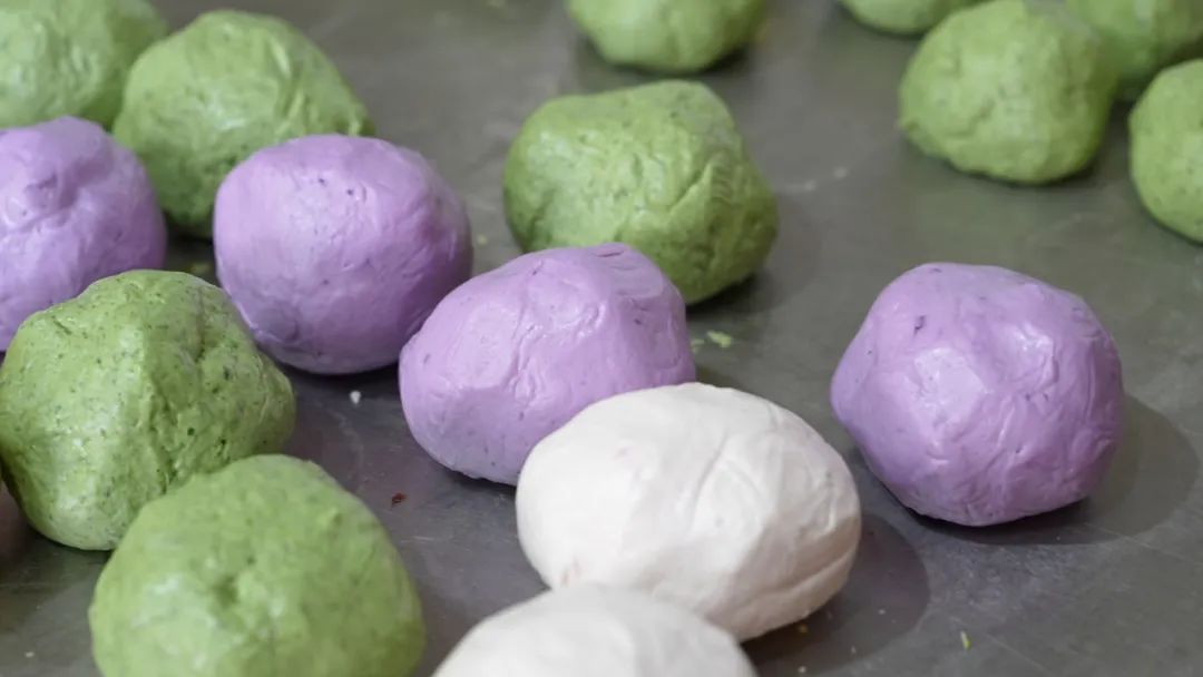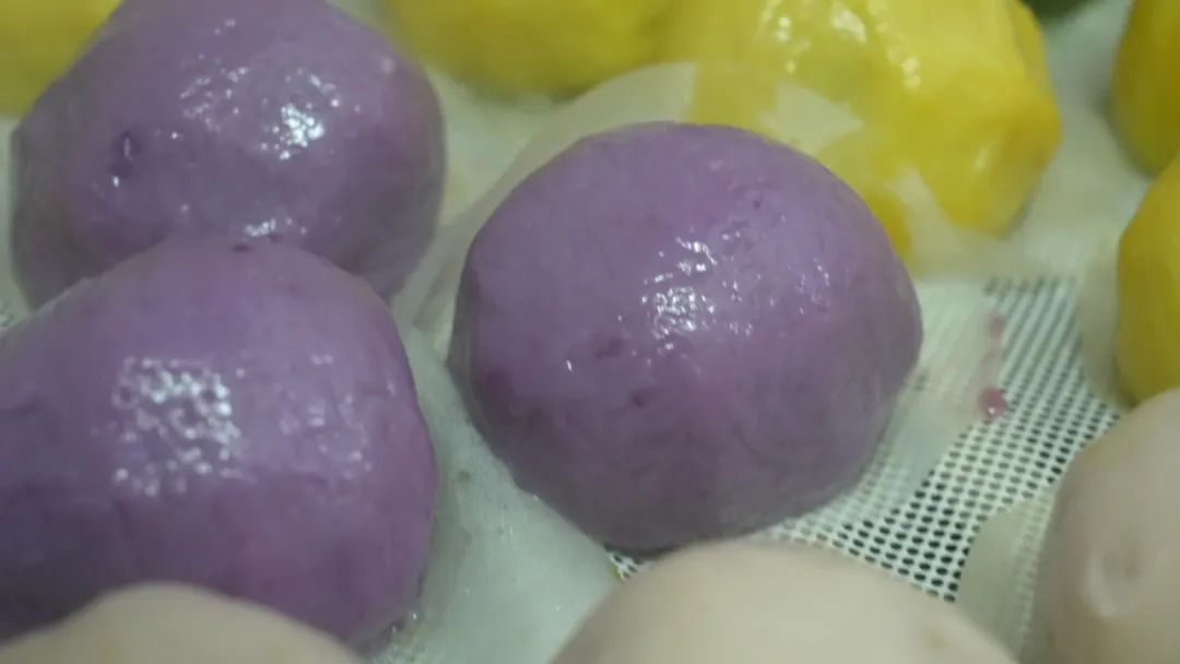 粉色的是草莓味,黄色的是南瓜味,紫色的是山芋味……紫薯味的青团是在糯米粉里面加一定比例的蒸熟的紫薯,接着加一些牛奶和成面,牛奶的加入为青团增添了一股奶香味。