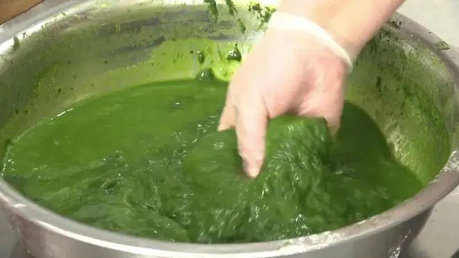 沈静青团的招牌,其外皮是添加天然的“泥胡菜”制作而成。“泥胡菜”,颛桥本地人又称绿草,常用它来做青团,具有清凉解火的功效,对人体颇有好处。把“泥胡菜”的黄叶子去掉后加点小苏打,再焯水后打汁,接着拌在糯米粉里面,就会出现天然的绿颜色。