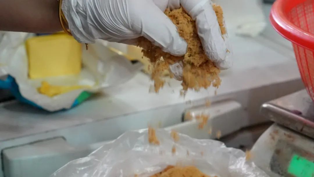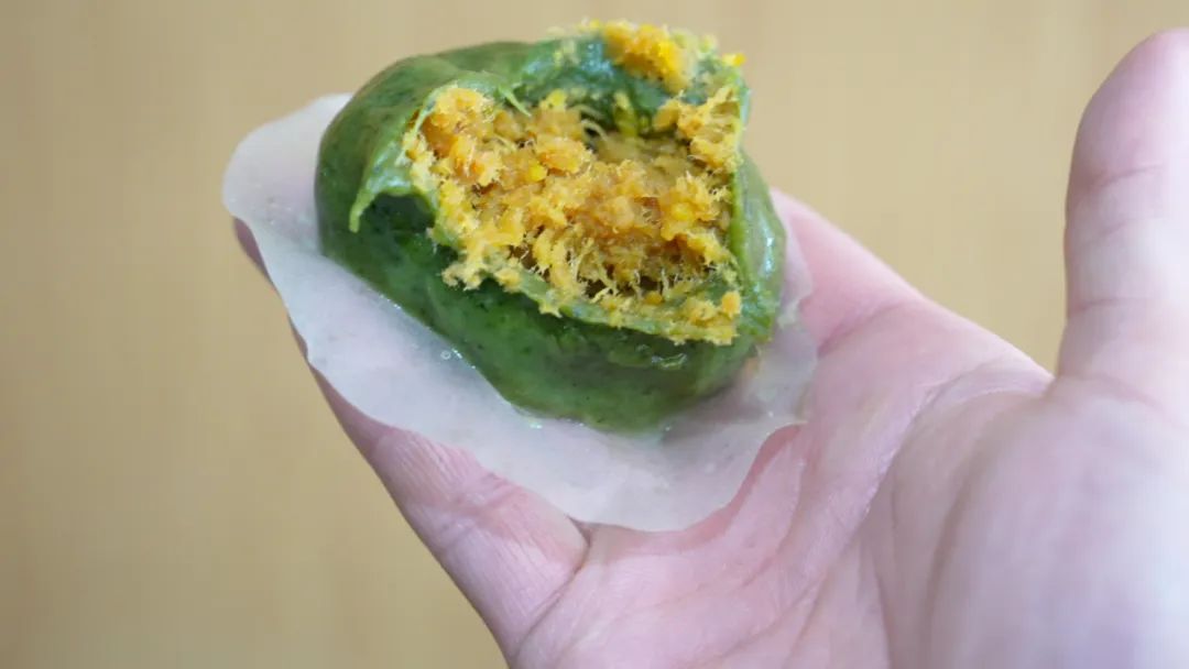 记者挑了一只肉松味的,摆在手上还挺重,估计有二两。咬下一口,外皮很糯,并且有一股自然的绿草清香。肉松由于是手工炒制的,口感非常细腻,味道很不错!