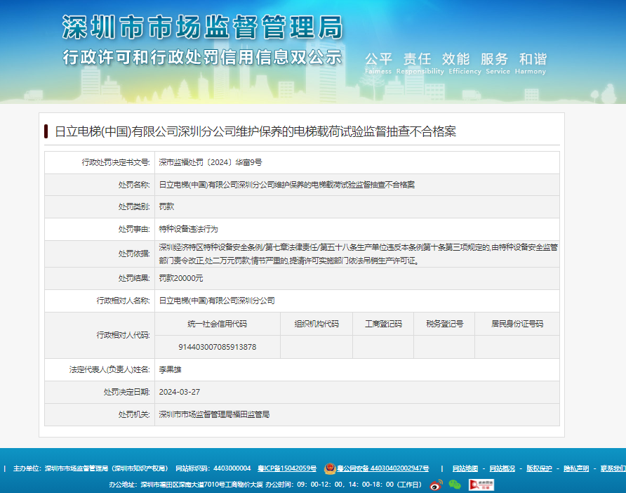​日立电梯(中国)有限公司深圳分公司维护保养的电梯载荷试验监督抽查不合格被罚