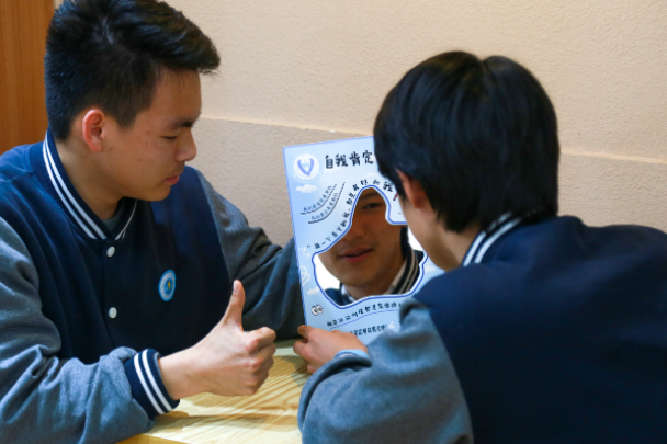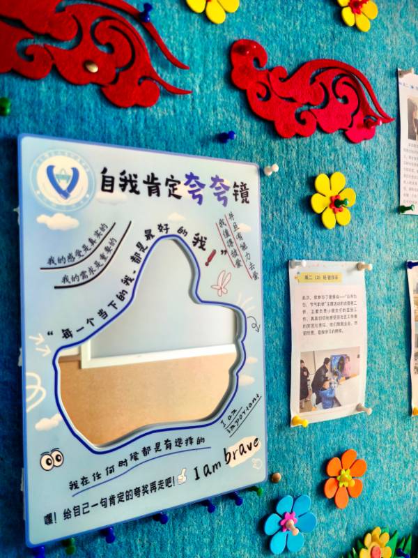 “每一个当下的我,都是最好的我”“我值得被爱并且有能力去爱”“我在任何时候都是有选择的”“我的感受是真实的,我的需求是重要的”……在华东理工大学附属中学,从预备到高三,7个年级都有各自的年级板报。这个学期开始,一块写满鼓励的A4大小浅蓝色亚克力板,出现在每一张板报上。亚克力板最中央,一面透亮的镜子被设计成了“竖大拇指”的形状,映衬出一张张青春的脸庞。