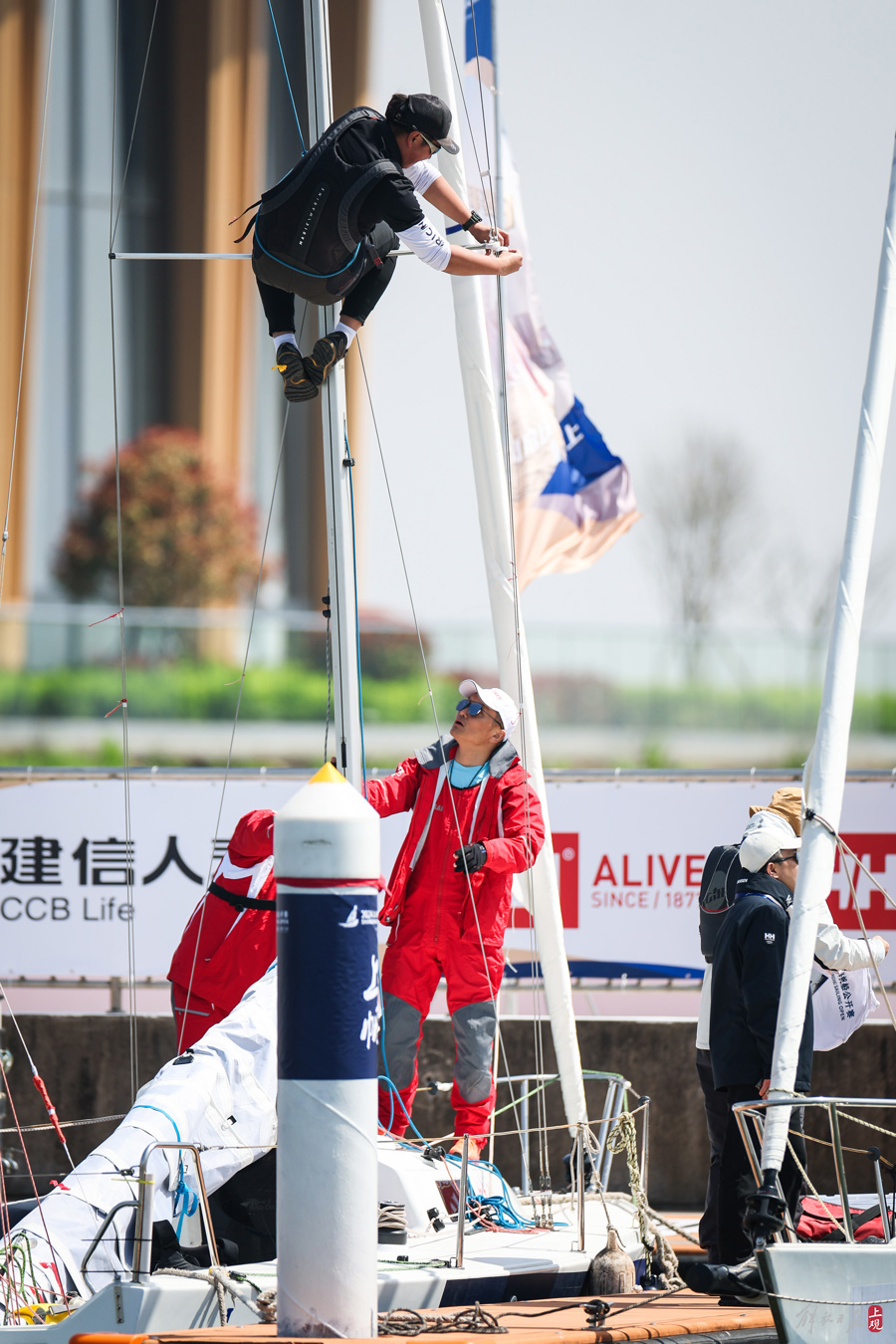 运动员和教练团队对下午参赛的J80级帆船进行准备参赛需要的各类工具。