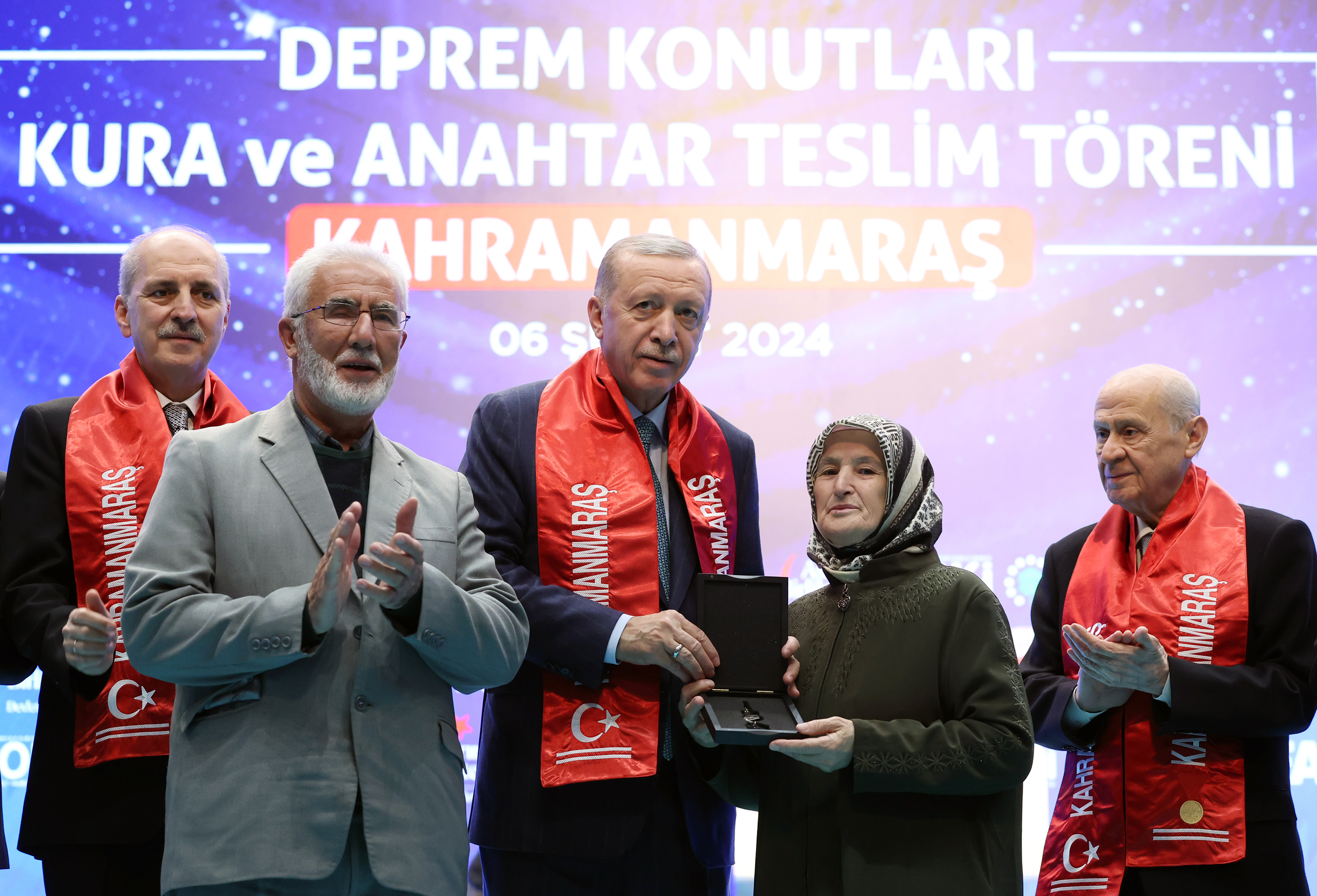 2月6日,土耳其总统埃尔多安(中)在卡赫拉曼马拉什市出席震后新建房屋交接仪式。新华社发(穆斯塔法·卡亚摄)