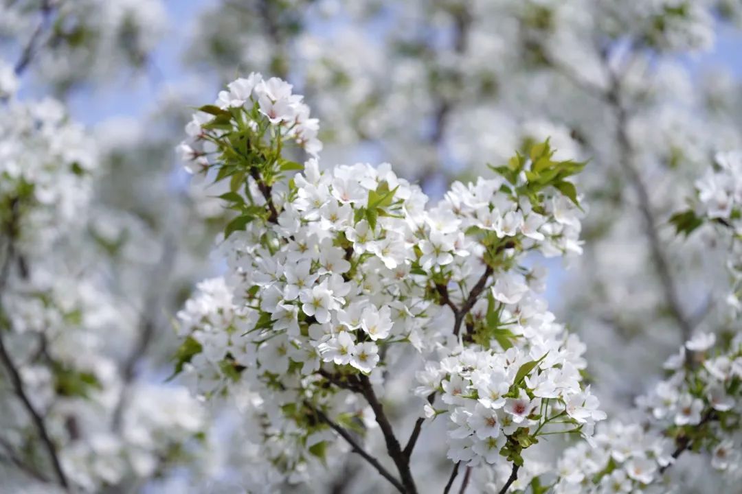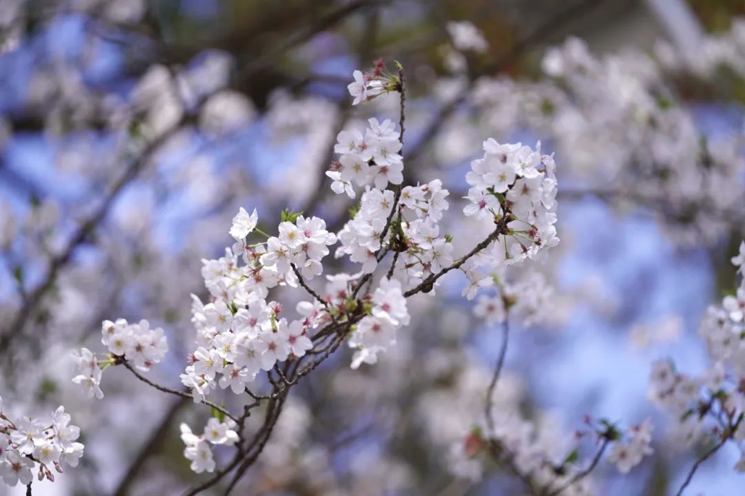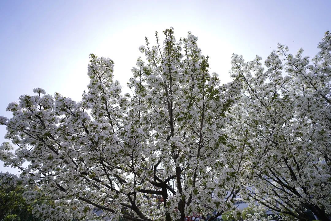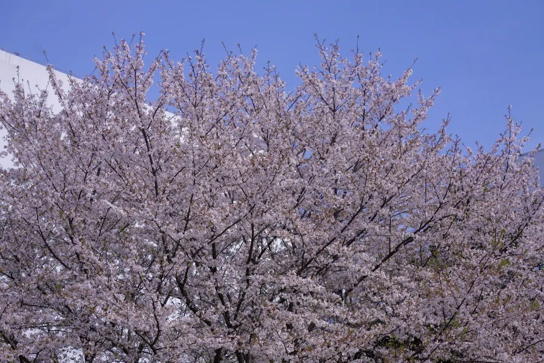 成片的樱花竞相开放,构成一幅幅春日浪漫图景。一树树粉白樱花如云似霞,一朵朵花瓣竞相绽放,为繁忙的空间增添了别样的生机,勾勒出美丽的图景。