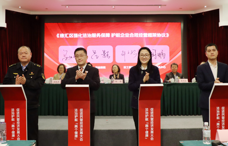 为进一步助力企业全生命周期合规,活动现场,徐汇区人民检察院、徐汇区市场监督管理局、徐汇区工商业联合会、徐汇区行政服务中心等四家单位共签《强化法治服务保障护航企业合规经营框架协议》(以下简称“框架协议”),在全区推进新入经营主体合规告知制度。