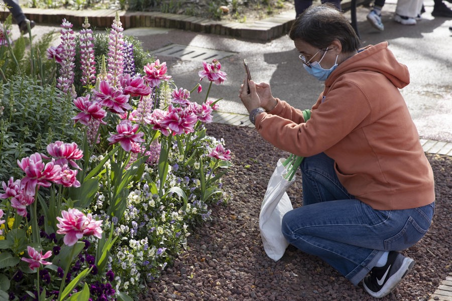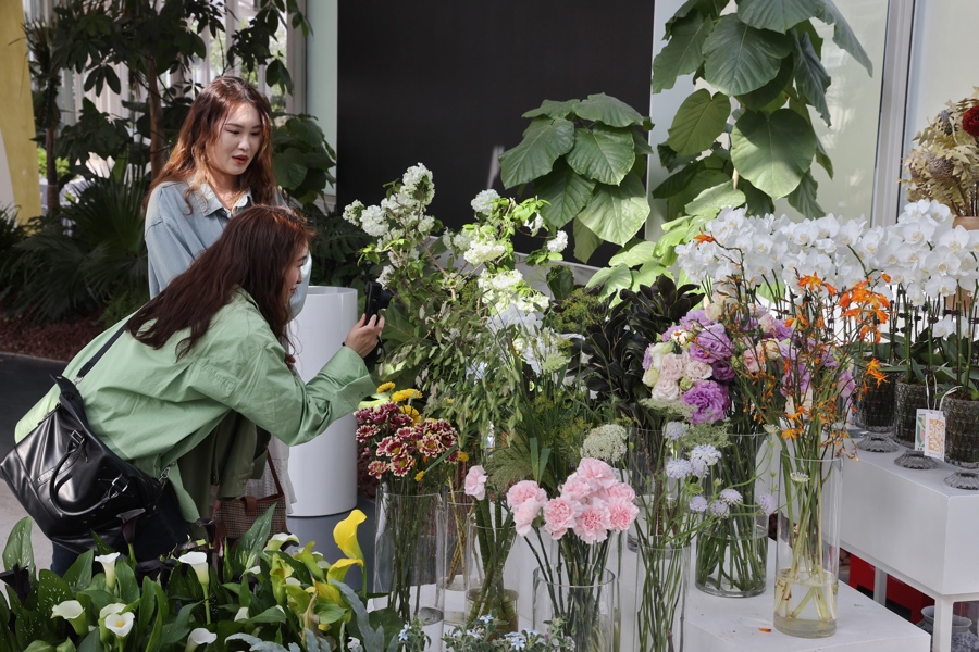市民在中山公园市民园艺中心欣赏当季花卉。