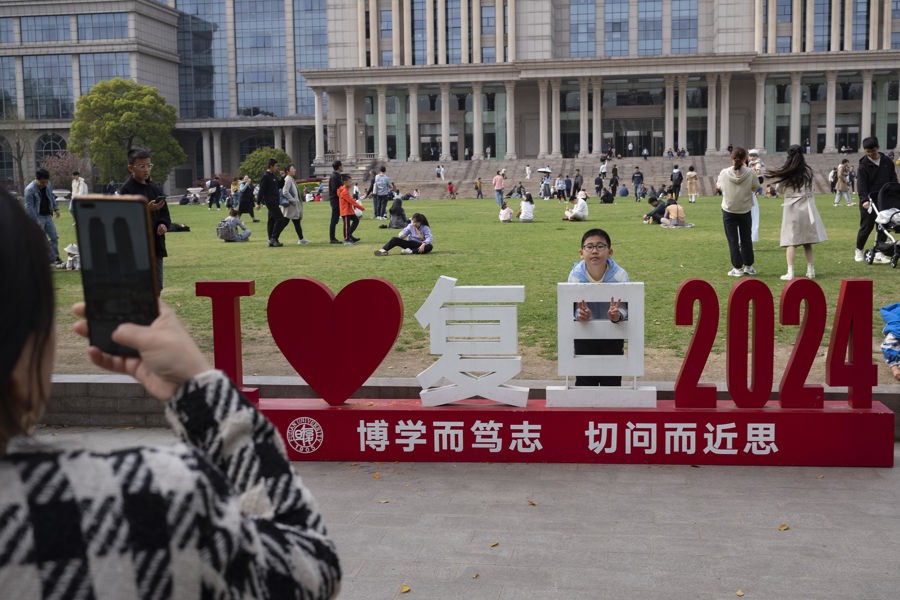 在复旦大学邯郸路校区,一位家长在为孩子拍照片。