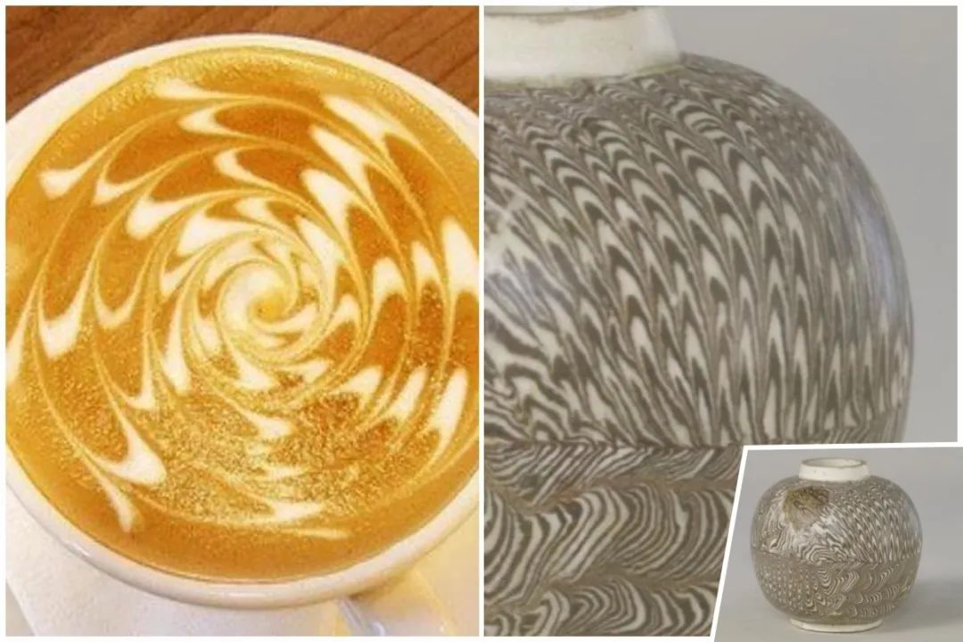 △咖啡拉花与故宫博物院藏宋代绞胎罐纹理对比