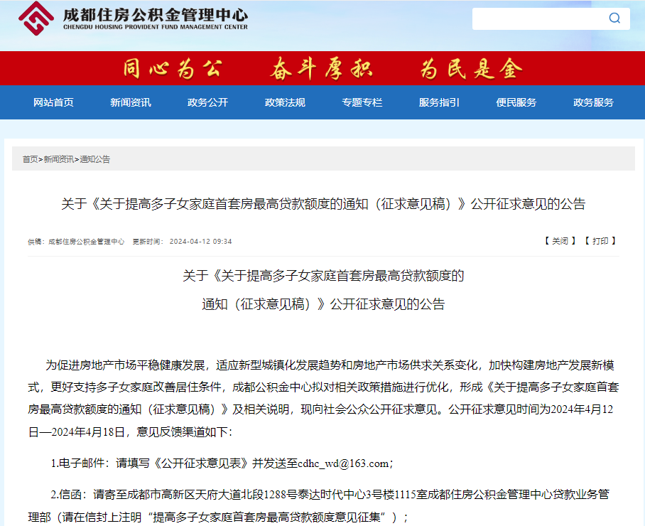 中国质量新闻网讯(顾爱龙)近日,为促进房地产市场平稳健康发展,适应新型城镇化发展趋势和房地产市场供求关系变化,加快构建房地产发展新模式,更好支持多子女家庭改善居住条件,成都住房公积金管理中心拟对相关政策措施进行优化,发布关于《关于提高多子女家庭首套房最高贷款额度的通知(征求意见稿)》公开征求意见的公告。