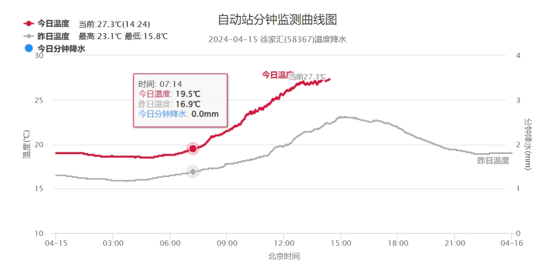 4月15日白天气温迅速上窜,全市最高气温普遍达到26℃~28℃,其中闵行站28.5℃为最高,再加之湿度较高,户外体感很是湿热。