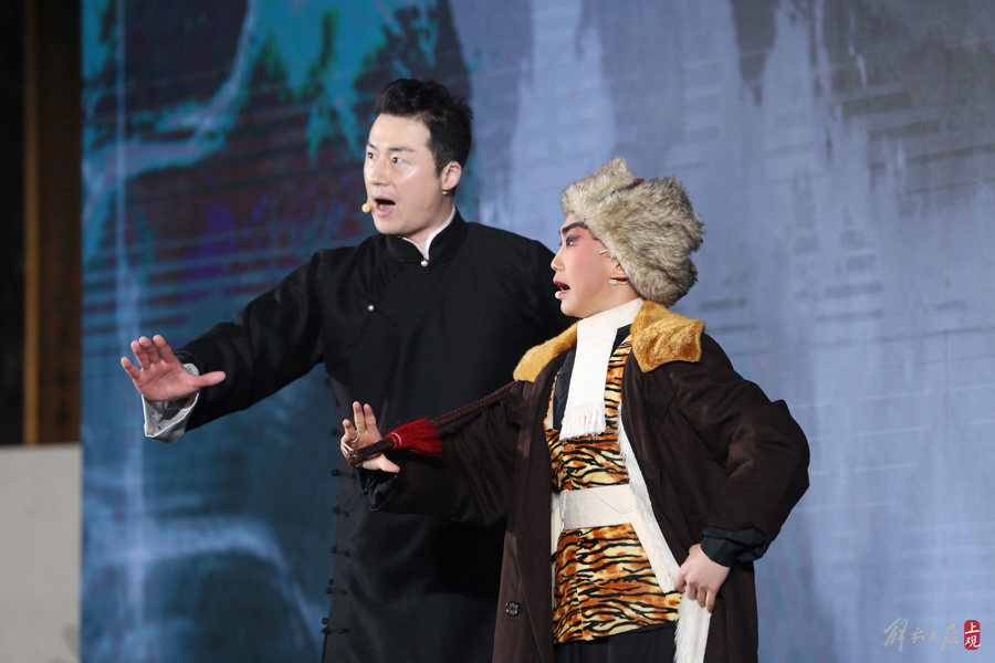校友蓝天与戏曲学校学生杨开鑫演唱《打虎上山》。