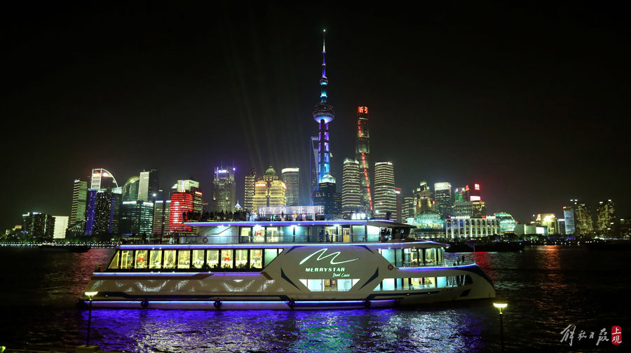 “精气神,共潮生”校庆主题游船从黄浦江驶过。