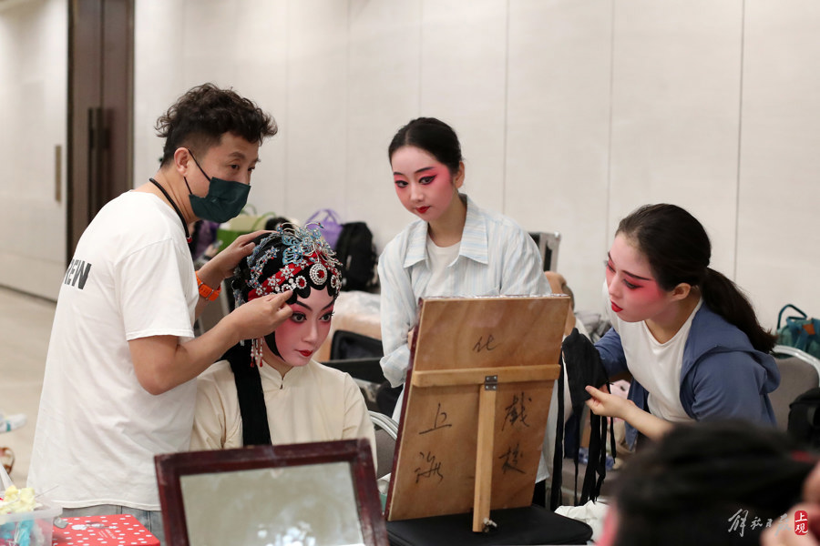 5年级昆剧班闺门旦谈菲儿在后台为70周年演出做准备,这次她和其他5位同学一起在《牡丹亭·惊梦》中扮演杜丽娘。虽然不是第一次演杜丽娘,因为老师和校友前辈都在台下看着,谈菲儿还是挺紧张的,她一遍遍练着老师教授的一招一式及回想老师讲解的人物内心,能代表学校出演她感到挺骄傲。