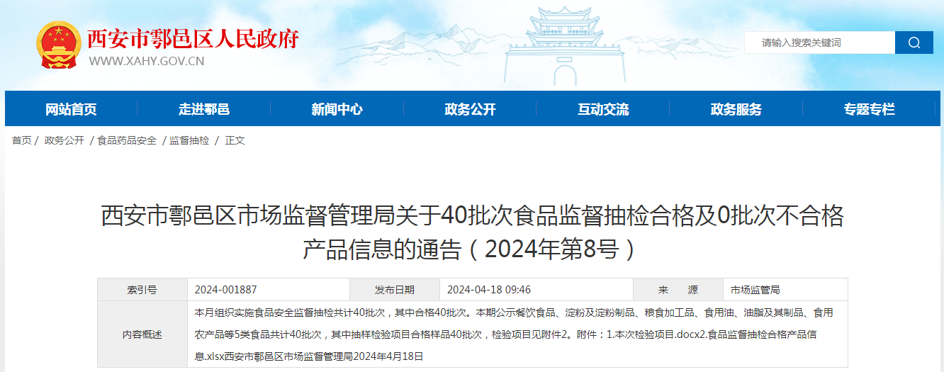 西安市鄠邑区市场监督管理局关于40批次食品监督抽检合格及0批次不合格产品信息的通告(2024年第8号)