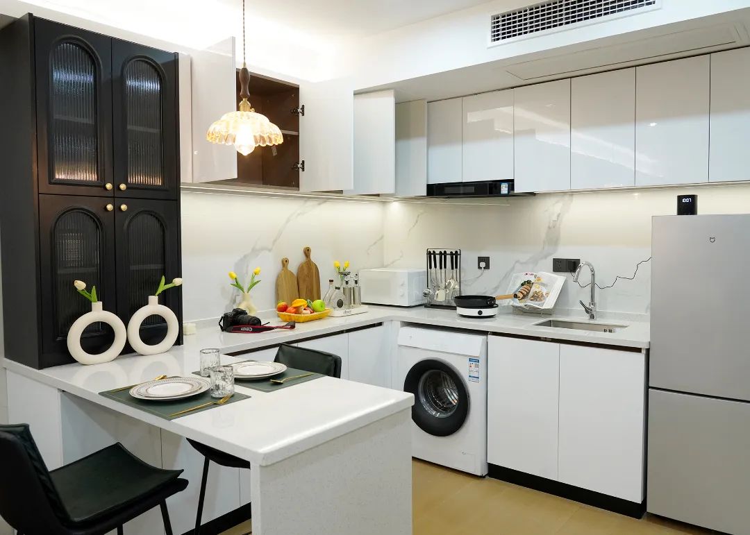 沙发、大床、衣柜摆放得错落有致;照片墙、艺术隔断、桌面小摆件、灯光布置等蕴藏着设计者的用心巧思;见缝插针打造出的收纳储藏空间,增添了实用的生活气息;隐形的投影设计,满足年轻人宅家看电影的需求。“大户型的餐厅,我们设计了一个操作台和一个吧台,平时可以邀请朋友简单聚餐。”