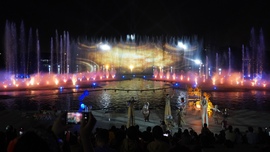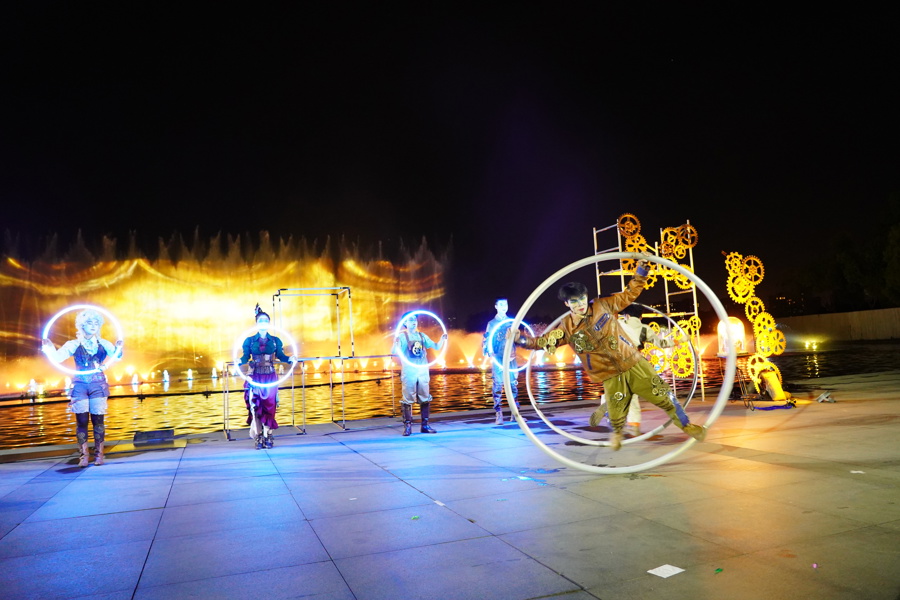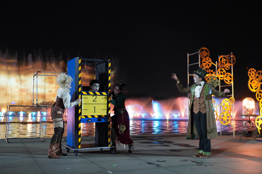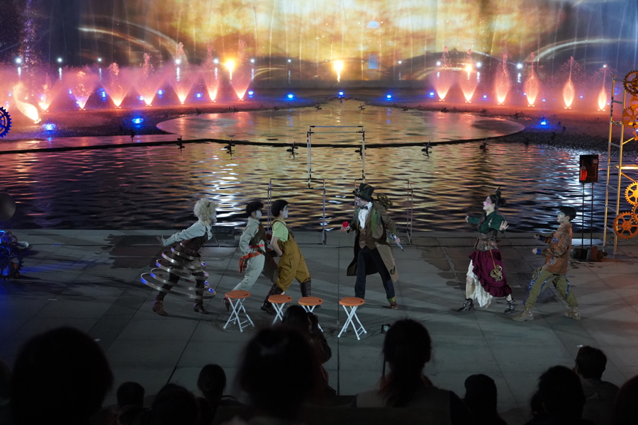 2024年“水景光影秀开箱特别演出”将在水景剧场呈现杂技+魔术《蒸汽世界》奇幻欢乐亲子舞台秀,《梦回丝路》主题音乐会·湖畔水景以及《九州行记》主题音乐会·湖畔水景共四场演出。