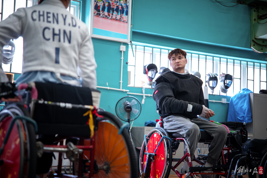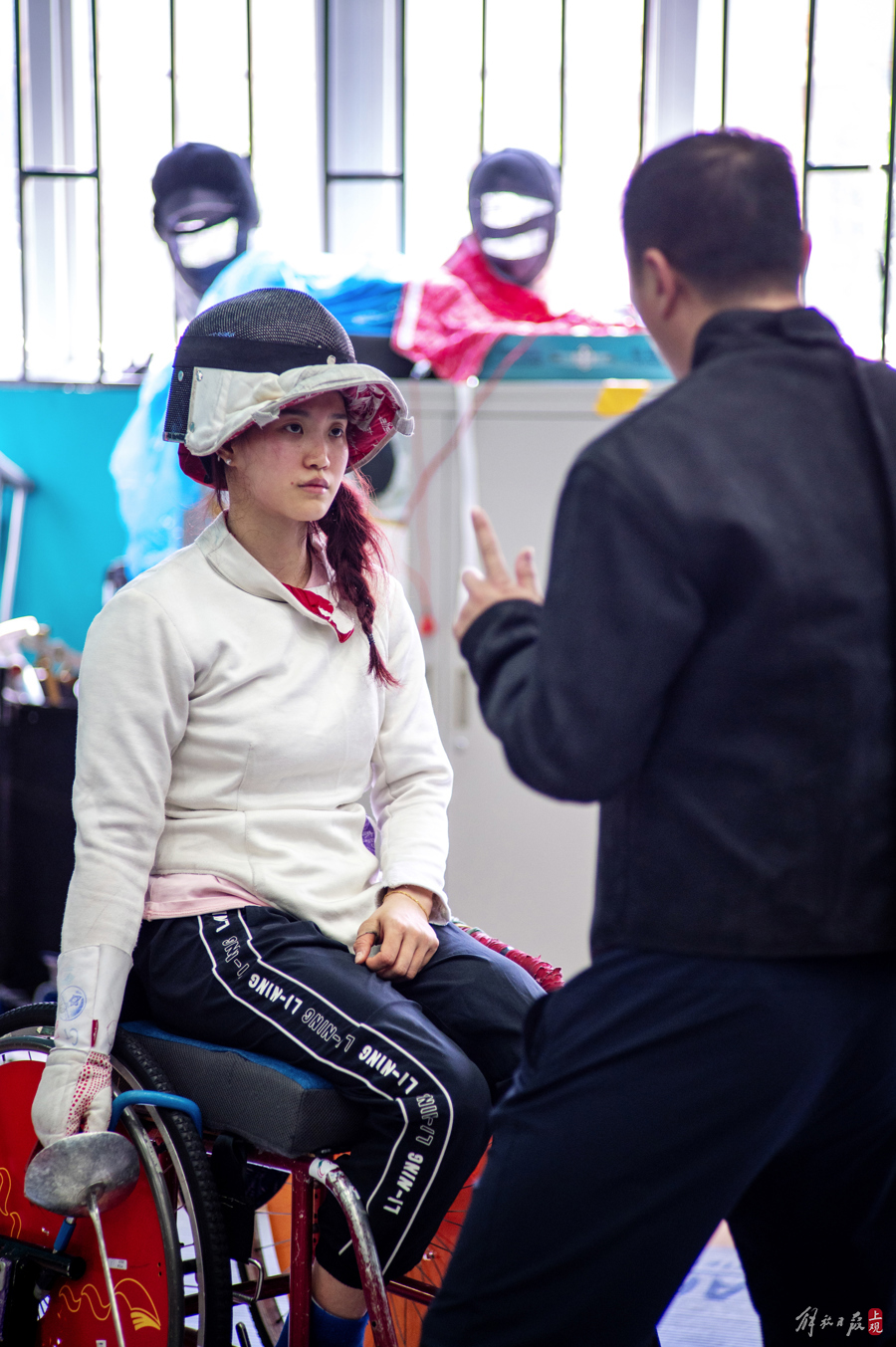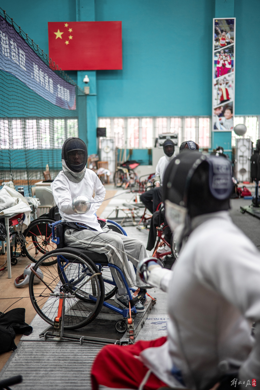 中午,早已过了训练时间,多数运动员留在场地,留在自己的轮椅上,和伙伴们热火朝天地继续练习着,训练场的上空时不时飘来一声如晴天霹雳般的呐喊——这是剑客们在拼尽全力刺出关键一剑时下意识反应。孔指导绕场一周,大声吆喝着“驱赶”运动员,让他们赶紧去食堂吃饭,然后午休。