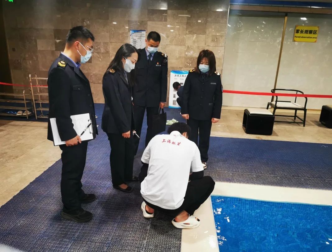 检查组联合检查了宝山区友谊路街道的瀚健身游泳池、杨行镇的活力滨江游泳池以及顾村镇的上城院子游泳池,针对救生员上岗及资质情况、监控设施设备、水质卫生情况、消毒药品的存放、工作人员是否办理健康证等进行严格的检查并提出具体整改要求。