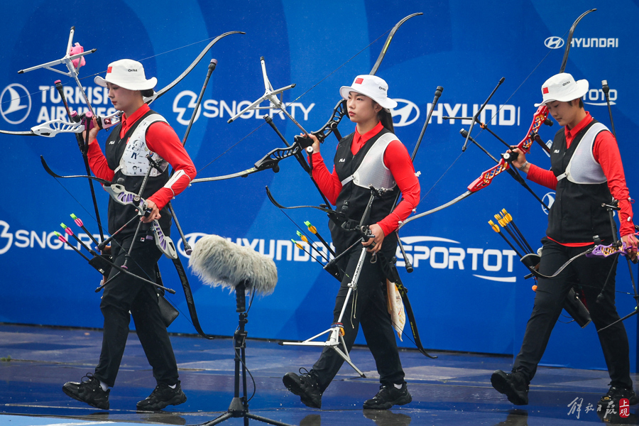 中国队选手杨晓蕾、李佳蔓和安琦轩在女子反曲弓团体决赛中。
