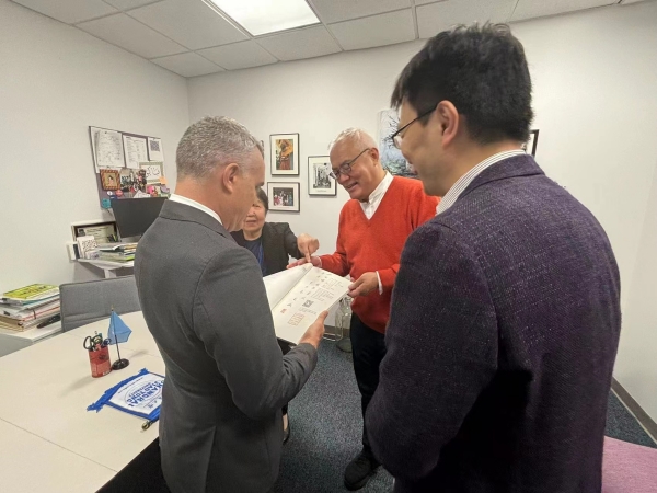 当地时间5月6日,上海交通大学人文学院代表团在人文学院院长助理、汉语国际教育中心主任王骏教授带领下赴联合国国际学校进行交流访问。交通大学教授周斌向联合国国际学校赠送了由曾任联合国秘书长的潘基文撰写推荐词的国际中文教育文化融媒体教材《HSK基础汉字书法与文化创意教程》。