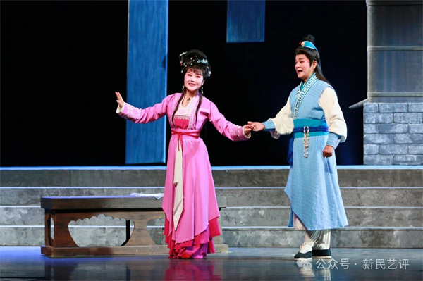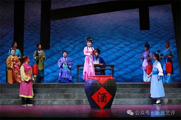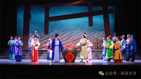 其二是“趣”,幽默风趣。能够吸引观众的优秀作品,一定不是板着面孔讲道理,而是寓教于乐的。这一特点在沪剧传统小戏中体现得特别明显。《酒魂曲》中就有许多充满乡土趣味、民俗气息的段落。比“酒”招亲一段中,李海虎、王金虎争相回答的三道“酒”题,说了酒的传说,饮酒的好处,酿酒的秘笈。看似大段的赋陈显得啰嗦,却让观众听得非常过瘾,还获得了一些“有趣而无用”的小知识。这一传统,似乎可以追溯到《徐阿增出灯》《女看灯》等传统沪剧赋子,长篇累牍细致繁复的描述中表达的其实是人们对于富足物质、精神文化生活的享受与满足,往大里说,是对幸福生活的感恩。
