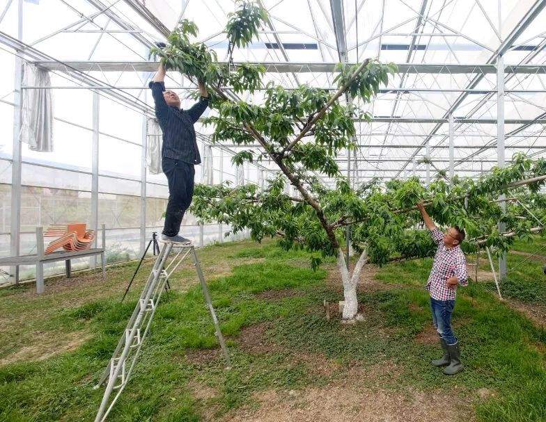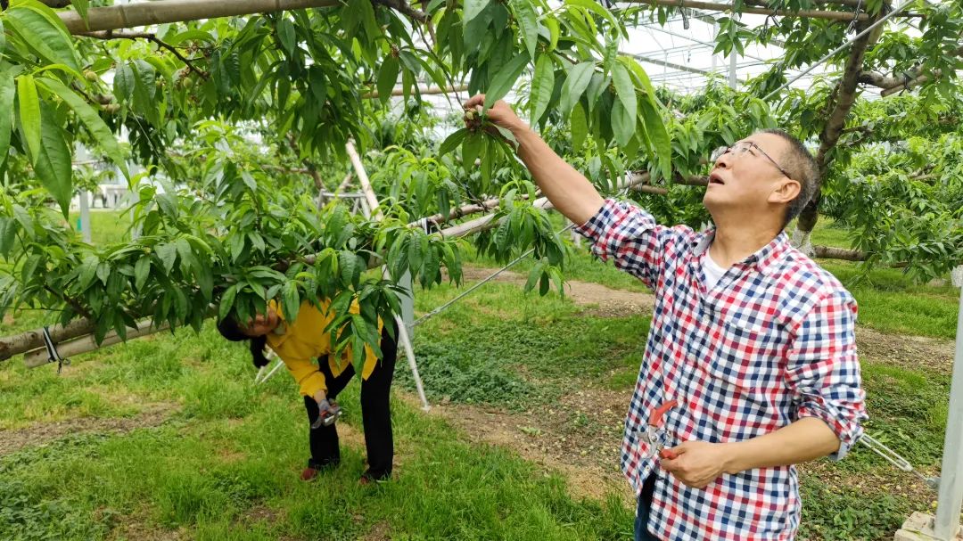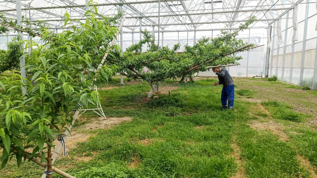 走进哈玛匠果园,大棚内一派繁忙景象。果农们架起梯子,手持剪刀,仔细观察果树的每个枝条,熟练地将不合格的幼果和多余枝叶剪除。正所谓“疏其繁枝,助其壮果”,疏果是桃树管理的关键步骤,也是该果园优质蜜桃高产的秘诀之一。