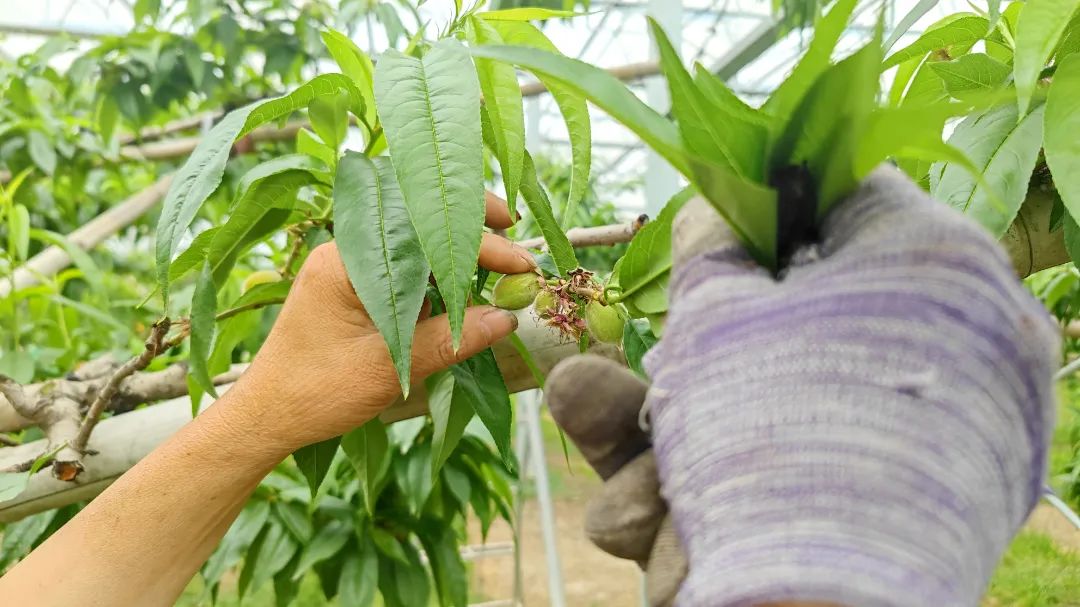 “我们正在进行第一次疏果。对于第一次疏果,我们对不同长度的果枝有不同的要求:对于10厘米左右的短果枝,我们仅保留位于枝条下方的一个桃子;对于20-30厘米的中等长度果枝,我们选择保留位于枝条中间的3-4个桃子;对于30厘米以上的长果枝,我们则保留5-6个生长方向向下的桃子。在第二次疏果过程中,对于30厘米以上的长果枝,我们可能需要进一步减少果实数量,仅保留3-4个桃子。在最后一次疏果,也就是定果阶段,我们将果实数量严格控制在每个果枝上1-2个,以确保果实的优质生长和成熟。”哈玛匠果园园长黄伟介绍道。
