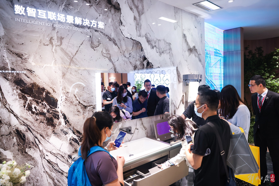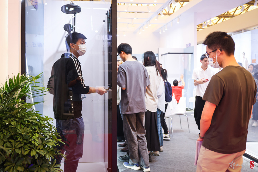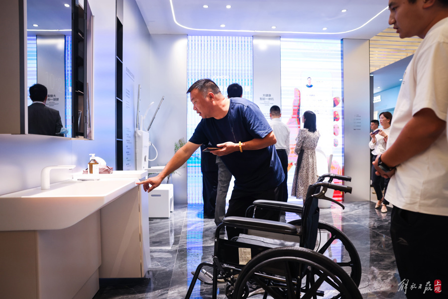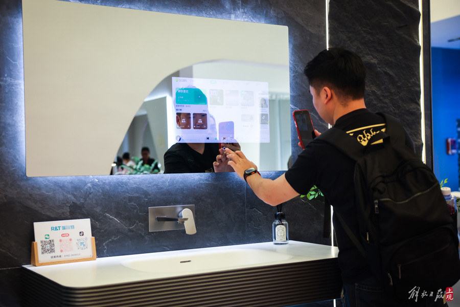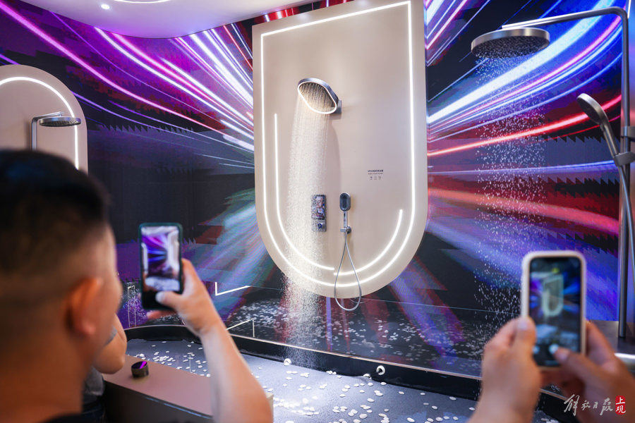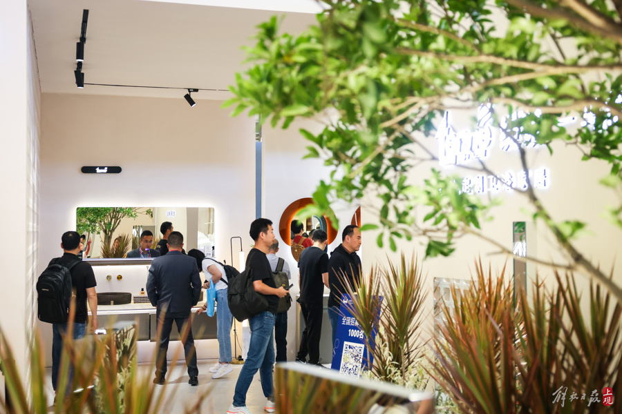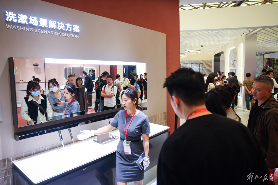 占地面积超2500平方米的九牧集团展馆,发布X90静音数智马桶、智能魔镜柜等多款“黑科技”产品。