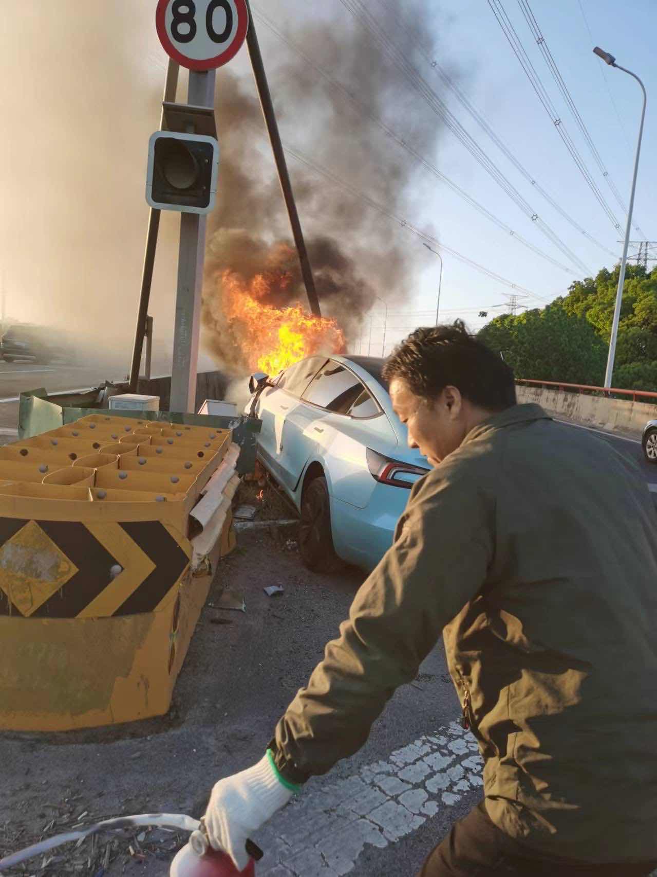 丁长星向澎湃新闻记者回忆,当时他和车上另外5个人,手抄灭火器和破窗锤走向事故车辆。车头仍在起火,有人对可能突爆的火势感到害怕不敢上前,有人试着用灭火器灭火。胆大的人走近车门拉了拉车门把手,门卡住打不开,有人喊了句,敲(碎)玻璃。
