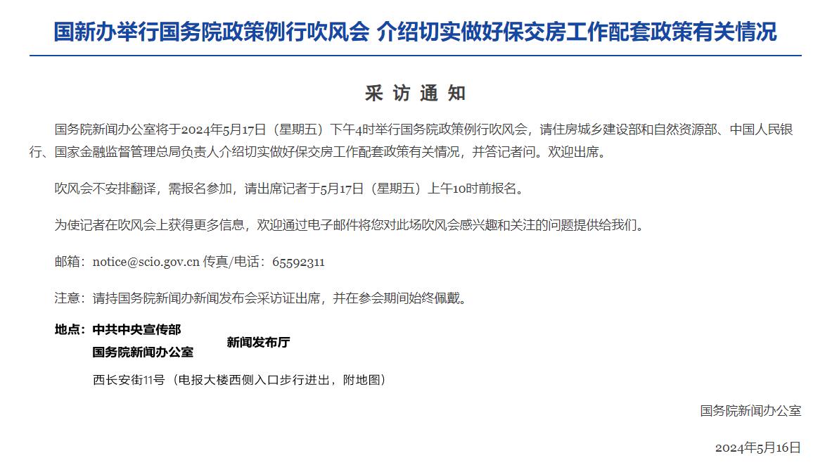 国务院新闻办公室网站5月16日消息,国务院新闻办公室将于2024年5月17日(星期五)下午4时举行国务院政策例行吹风会,届时,住房城乡建设部和自然资源部、中国人民银行、国家金融监督管理总局负责人将介绍切实做好保交房工作配套政策有关情况。