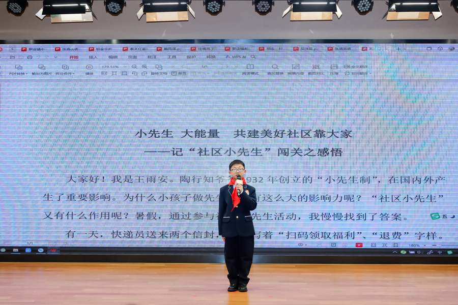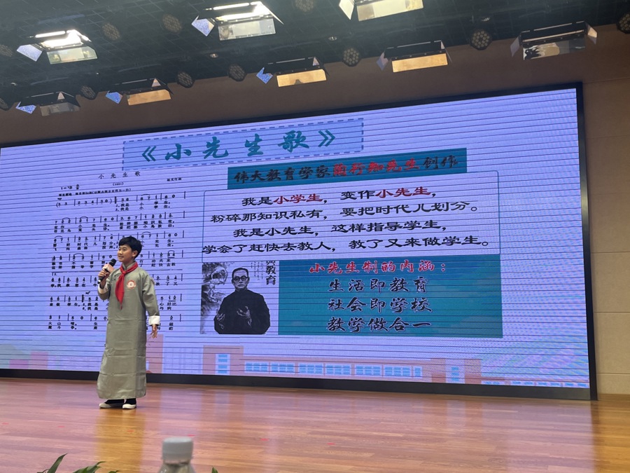 “我是小学生,变做小先生。粉碎那私有知识,要把时代儿划分。我是小先生,这样指导学生:学会赶快去救人,教了又来做学生。”当家住杨行镇紫辰苑的王乔恩身着长衫,字正腔圆地背出陶行知先生所作的《小先生歌》,台下立即响起欢呼。