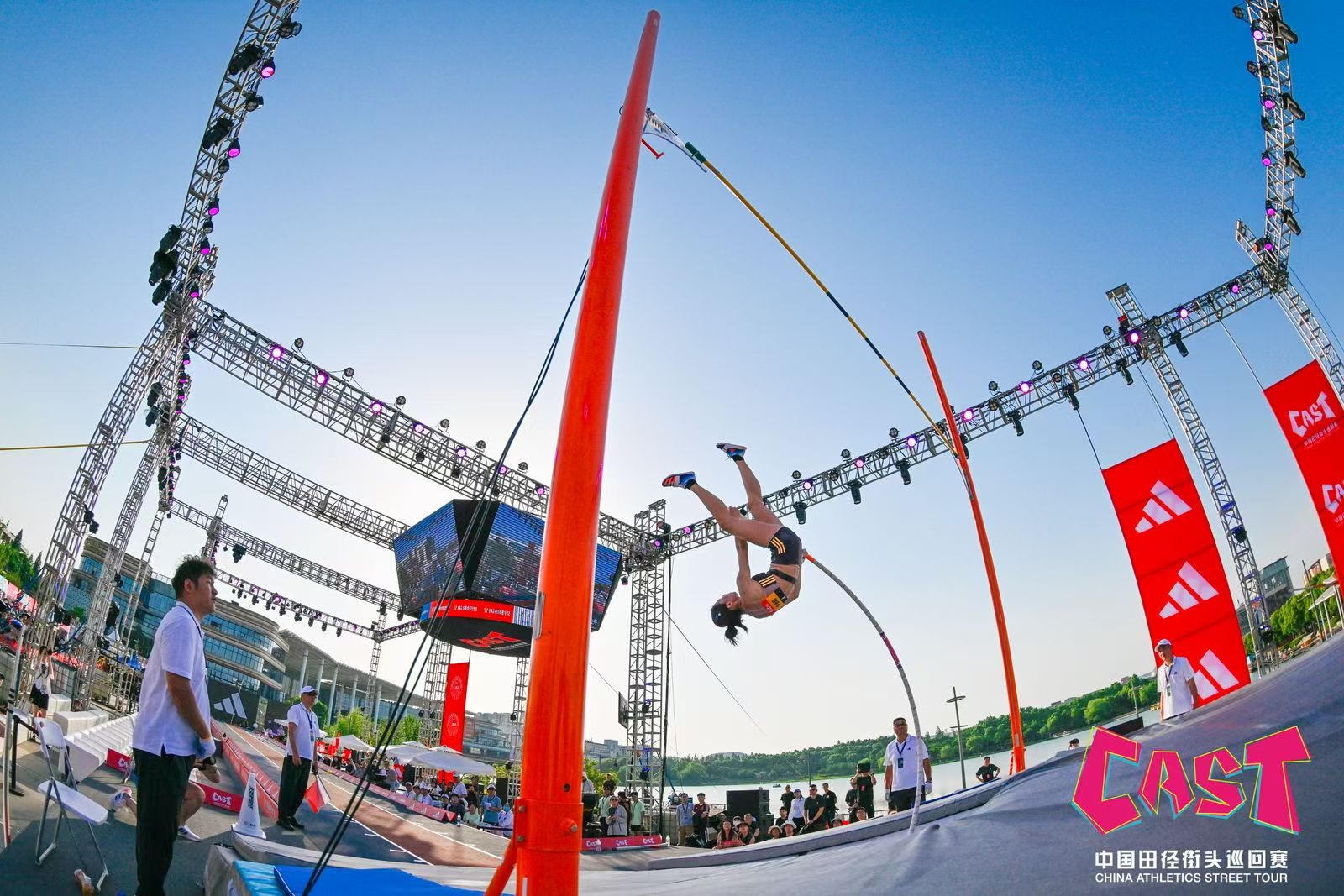 从下午开始,赛事举办地金鹰湖滨天地就聚满了“看热闹”的人群,无论是比赛现场还是互动体验区都是人头攒动。多位受访的市民都表示,第一次看撑杆跳高比赛,“没想到这么有意思”。